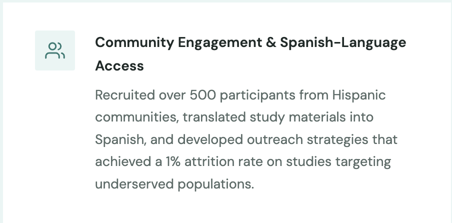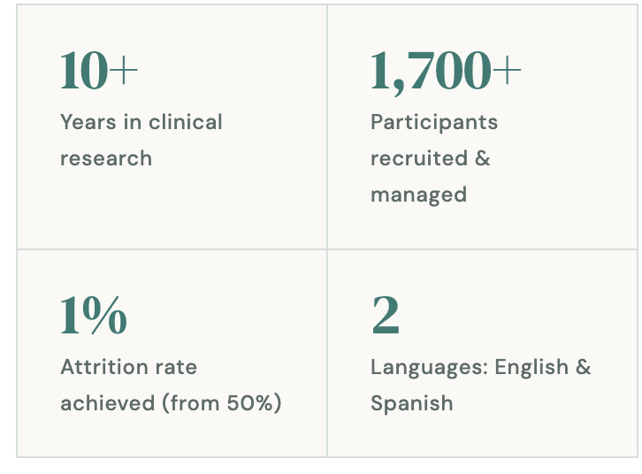 Elena is a bilingual Clinical Research Project Manager with over 10 years of experience in site management, participant recruitment, and community engagement across academic and industry-sponsored studies. She has worked directly with Spanish-speaking families, underserved communities, and participants across studies in neurology, infectious disease, behavioral health, and early childhood development, giving her a firsthand understanding of where communication breaks down and what it takes to fix it.